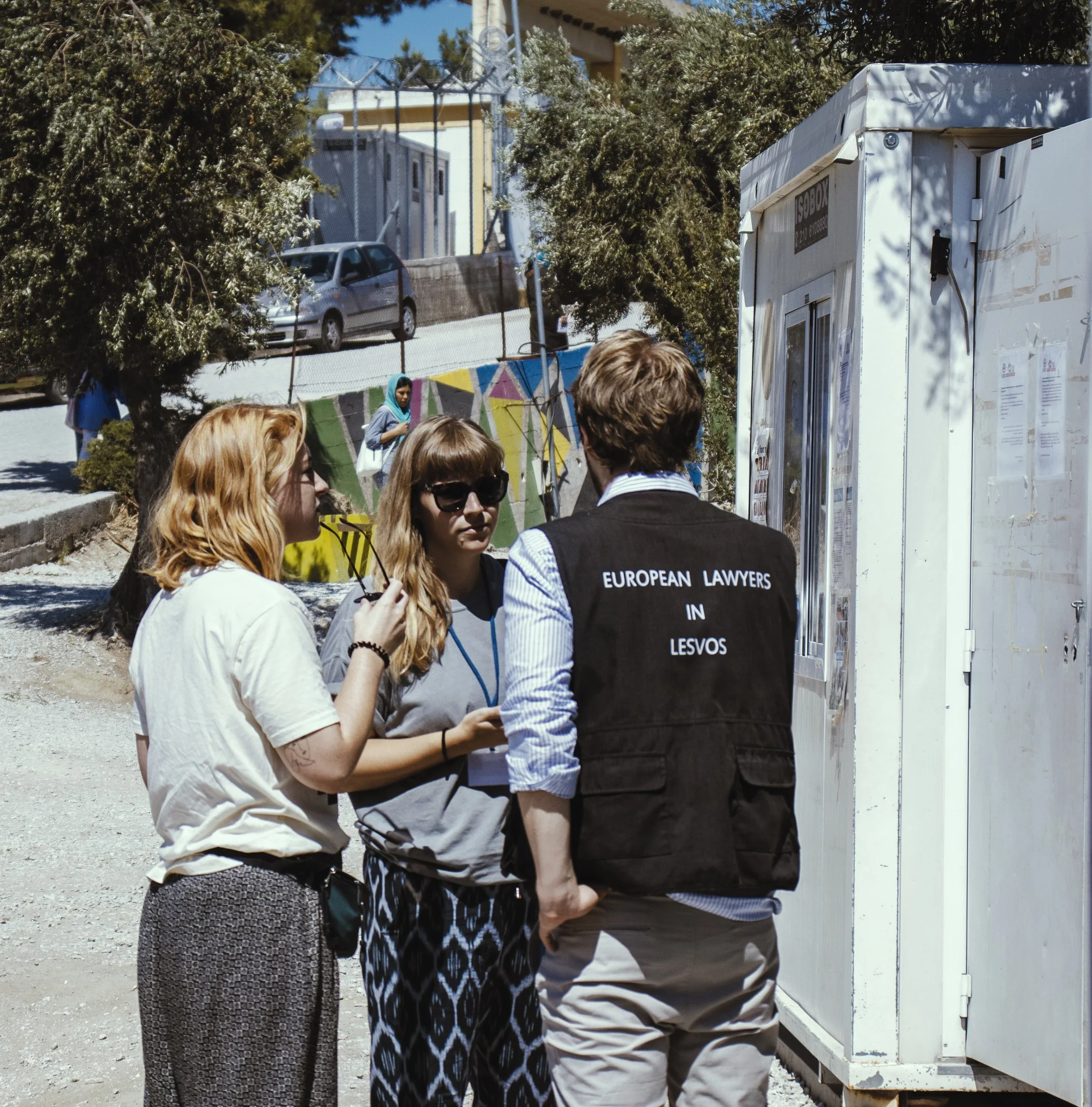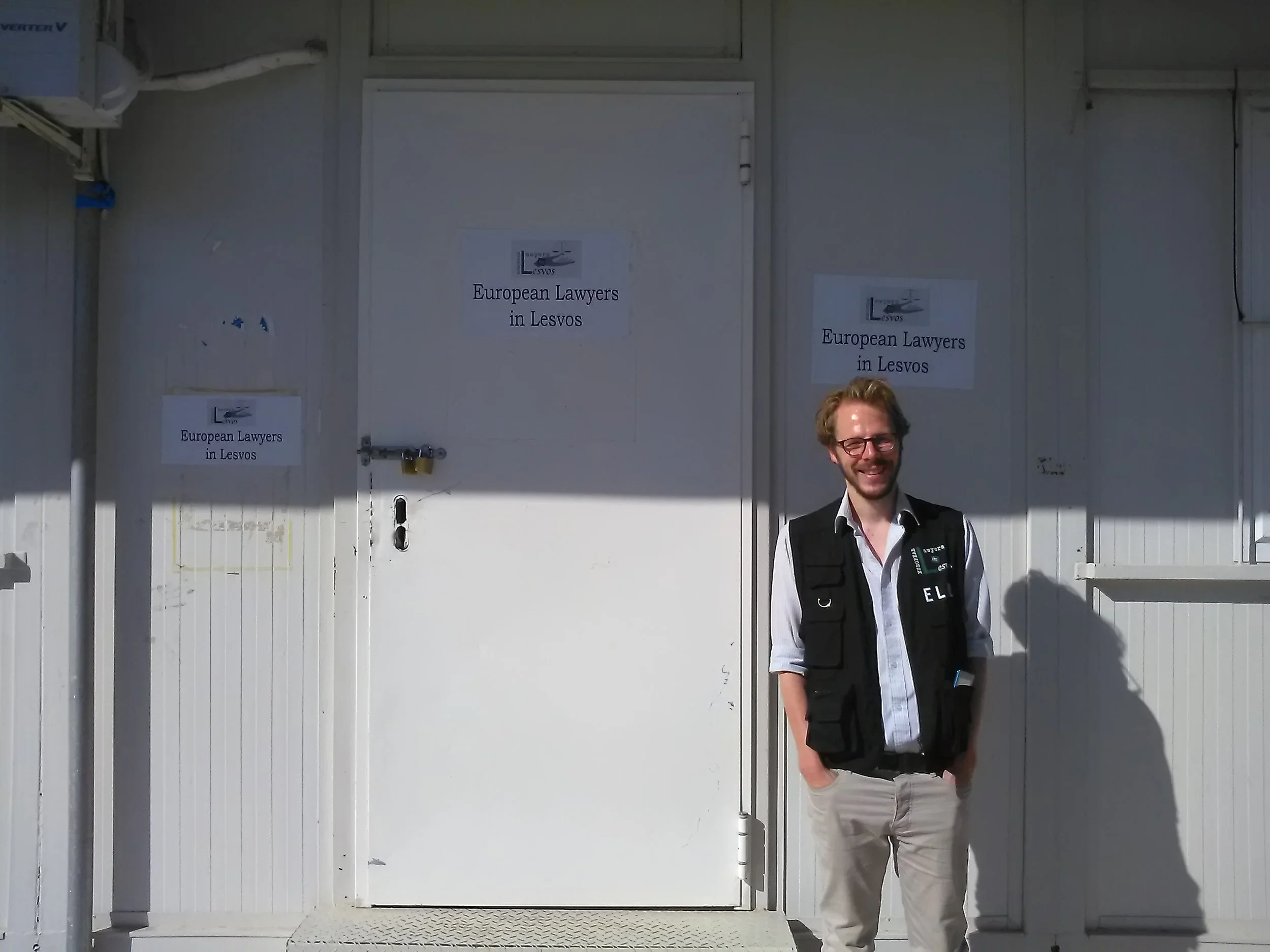 Phil in Moria camp in front of the ELIL container with 2 volunteer lawyers