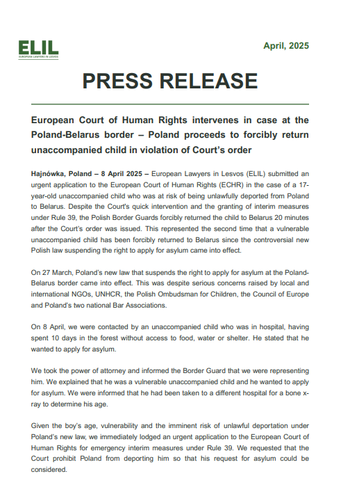 European Court of Human Rights intervenes in ELIL case at the Poland-Belarus border. Click here to read the full statement.